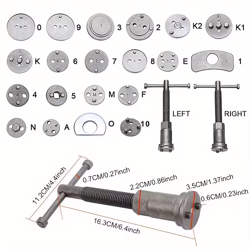 This brake calliper tool set allows you to manually rewind the pistons in brake callipers without harming the seals, saving time during brake pad replacement while protecting the bellows.