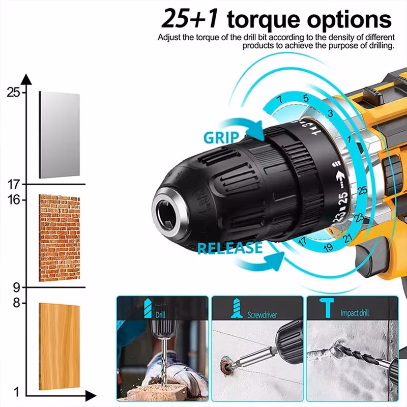 This cordless drill has a 1.5Ah battery that can extend working time. It has 25 torque settings to prevent over-drilling and damaging materials.